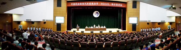 2013年9月23日下午5点,汽车工程系在学院新综合楼大礼堂举办了中德职业教育汽车机电合作(SGAVE)项目宣讲会。顾瑄主任、陈长春书记及SGAVE项目组四位教师以及五大汽车品牌4S店企业代表及2013级汽车检测与维修技术专业全体学生参加了会议。