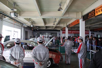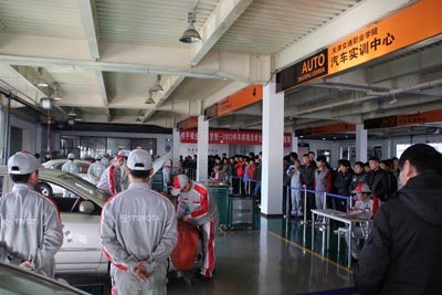 2013年12月27日,“丰田订单班”阶段性技能考核在汽车实训中心如期进行。本次考核是在完成学生个人理论知识、汽车维护单项技能考核的基础上,以“携手竞技,放飞梦想”为主题、以团队协作分组竞赛方式完成的汽车维护项目综合考核。于静副院长率教务处、督导室、职教所负责人及汽车工程系教师、汽车检测与维修技术专业在校生参加了观摩活动。