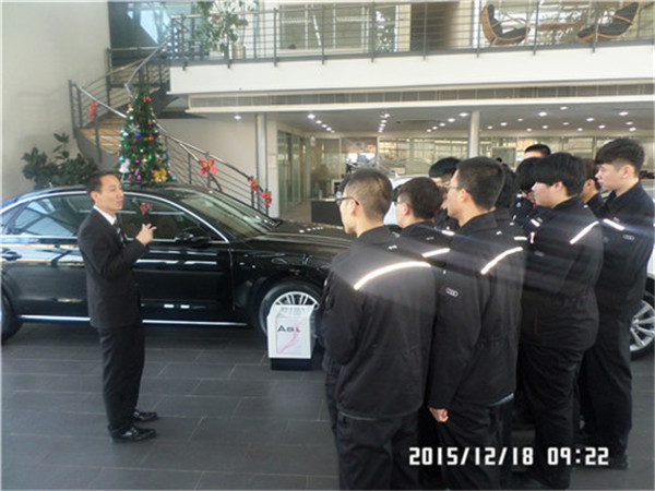 在捷丰汽车4S店领导的精心安排下,奥迪项目师生先后参观了维修车间、服务接待前台、奥迪汽车展厅等,并且企业相关部门领导亲自为学生们进行各工位的工作流程和专业知识的讲解。同学们通过参观了解了生产一线的实际环境,也见识了学校没有的教学车辆和设备。