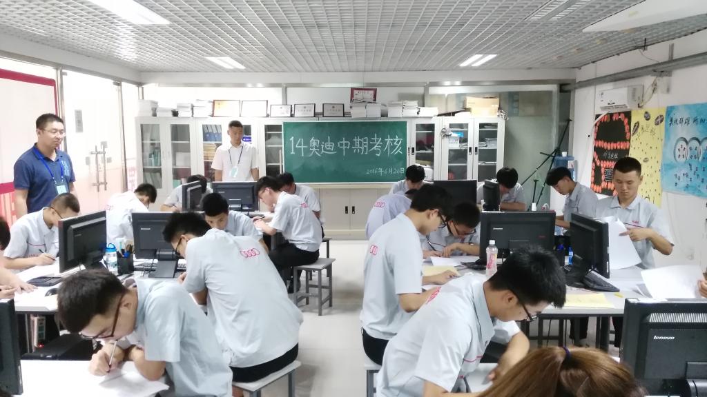 2016年6月20日至6月24日,汽车工程学院2014级奥迪订单班中期考核和2013级奥迪订单班毕业考核工作在学院培训中心举行。本市捷丰奥迪、中乒北奥、中升百得利、永濠奥达、九州紫阳、华奥兴业6个奥迪经销商的技术经理或培训师及我院奥迪订单班项目成员方斌、于晓喜、贾启阳教师进行监考。