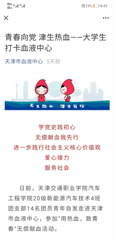 此次汽车工程学院团员青年献血打卡天津市血液中心,受到天津市血液中心的充分肯定,天津市血液中心在网站和微信公众号上以“青春向党 津生热血——大学生打卡血液中心”为题予以宣传报道。天津市血液中心体采科副主任刘锐为同学们自发献血的团日活动点赞:“非常感谢每一位同学的爱心奉献,新时代的团员青年是我们党赓续向前的生力军,同学们献血的善行义举可以看出天津交通职业学院在大学生思想政治教育上——立德树人,重在践行。6月14日第18个世界献血日到来之际,我们欢迎更多团员青年能够像天津交通职业学院同学们一样以献血打卡的方式走进天津市血液中心,见证成长,奉献社会。”