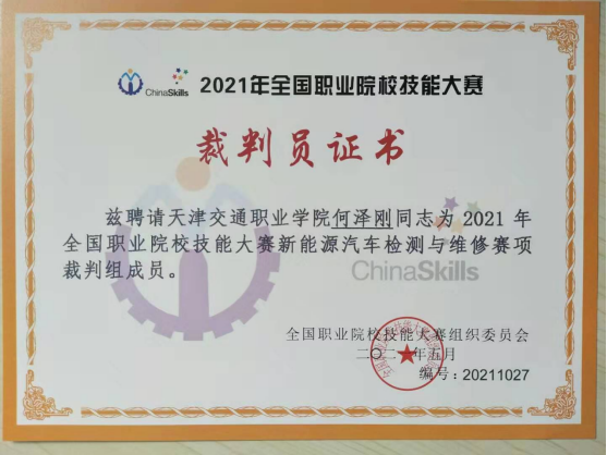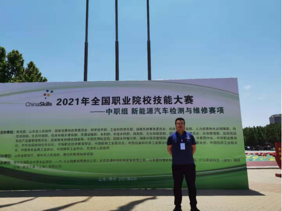 2021年6月18日至21日,由教育部主办的全国职业院校技能大赛中职组新能源汽车检测与维修赛项在山东德州交通职业中等专业学校举行,经过国赛组委会遴选,我院汽车智能技术专业何泽刚老师被聘为该项赛事的裁判员,并圆满完成了此次国赛执裁工作。