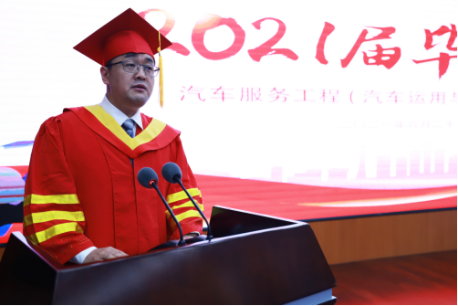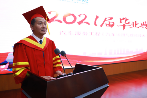 毕业典礼在庄严的国歌中拉开序幕。天津职业技术师范大学汽车与交通学院岳东鹏院长宣读毕业决定,宣告本届61名毕业生正式毕业并获得学士学位。就职于天津蔚来汽车销售服务有限公司的2021届毕业生代表张健豪同学发言并带领全体毕业生宣誓,天津清智科技有限公司企业代表----2020届毕业生段恒同学发表感言。铿锵的誓言,满载着收获、喜悦、梦想与期待;感人肺腑的感言寄托着学生对学校的感恩。天津交通职业学院汽车工程学院曹向红院长寄语同学们,表达了对同学们的眷恋之情,希望同学们在未来的人生道路上更加精彩。典礼最后,天津职业技术师范大学李康副校长致辞,向广大毕业生提出要坚定信念立大志等四点希望与大家共勉;学院于海祥院长致辞,列举优秀毕业生、优秀教师的感人事迹勉励学生要脚踏实地、行稳致远、逐梦前行。