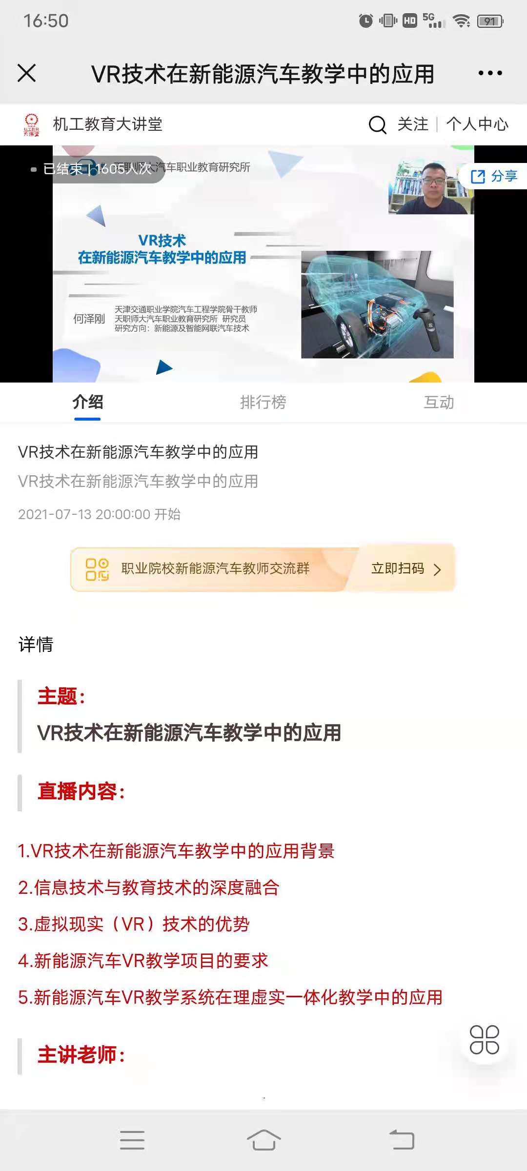 2021年7月13日,我院何泽刚老师受机械工业出版社邀请,在机工教育大讲堂作了《VR技术在新能源汽车教学中的应用》主题报告,报告采取直播的方式,吸引了来自全国职业院校的教师1605人次参加。