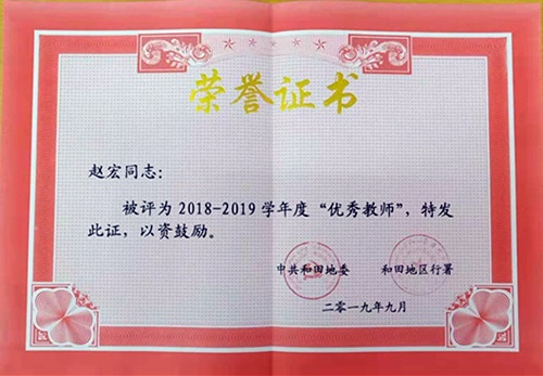 恰逢第三十五个教师节,新疆和田地区召开了“和田地区庆祝第35个教师节大会”。作为天津市第九批援疆干部人才,天津交通职业学院援疆教师赵宏在会上受到表彰。他获得了“和田地区优秀教师”荣誉称号。据悉,和田职业技术学院三名教师获此殊荣,而赵宏是唯一获得此项殊荣的援疆教师。